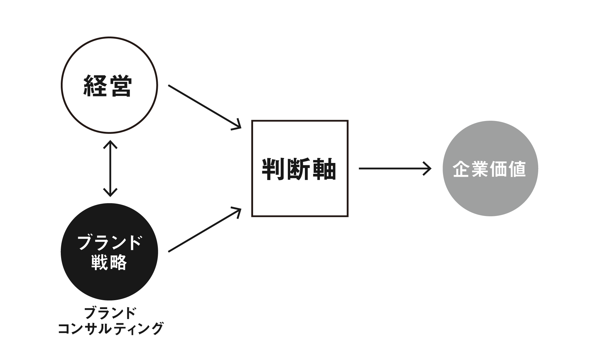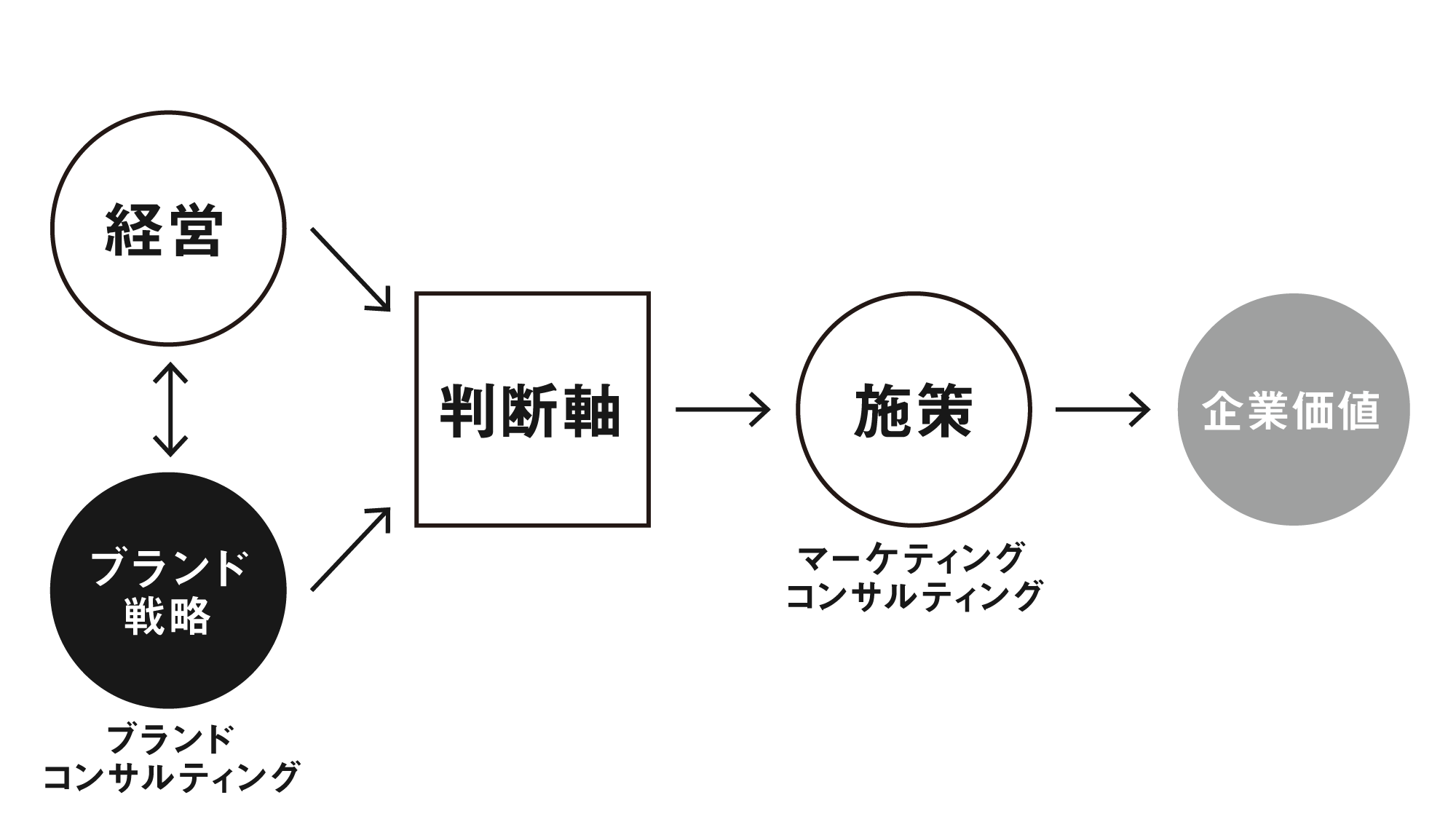一方、ブランドコンサルティングは、ブランド戦略を軸に企業の方向性や優先順位を整理する支援です。「どの価値を提供するのか」「どのように認識されるべきか」を設計し、経営とブランドを接続します。